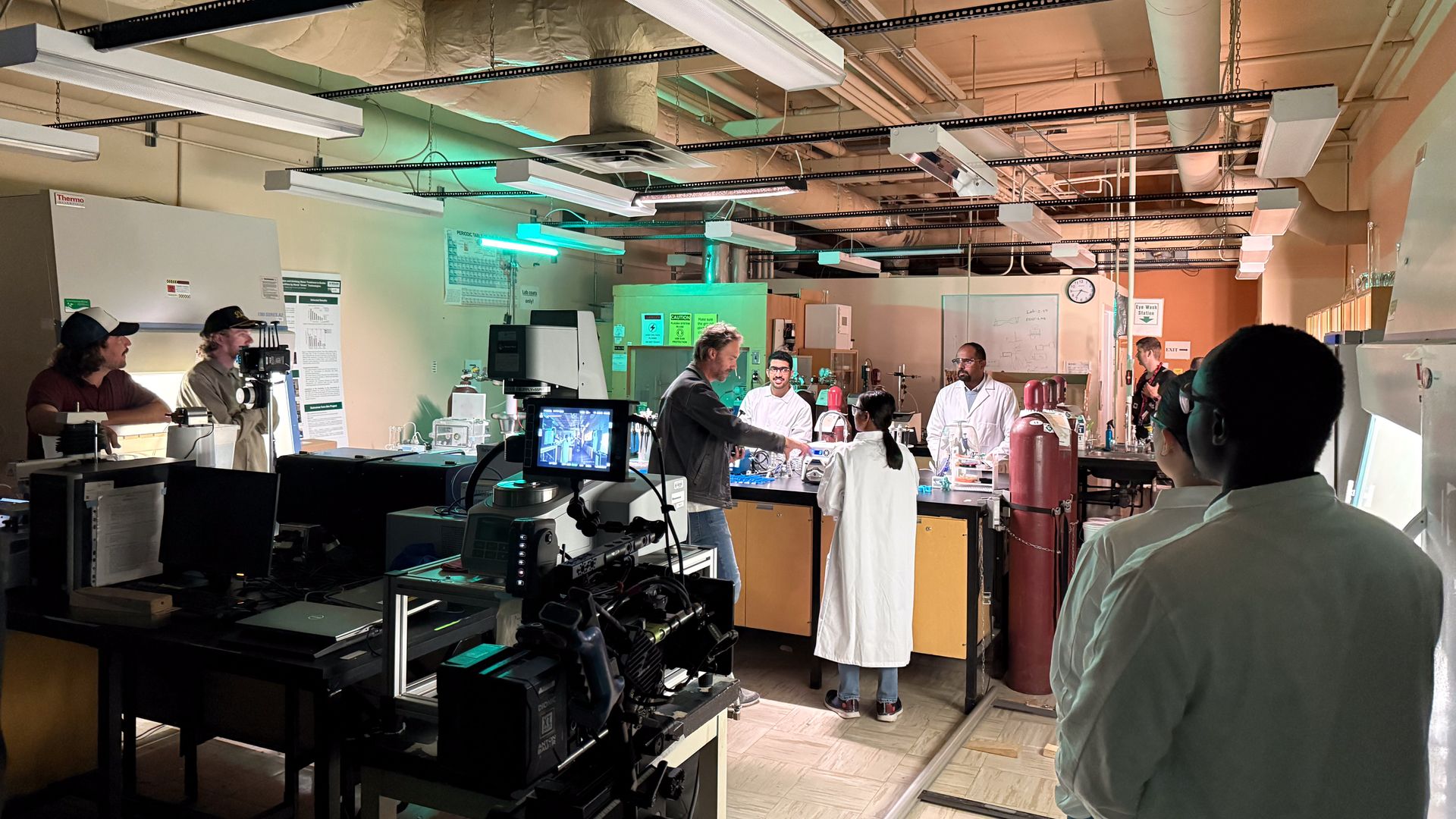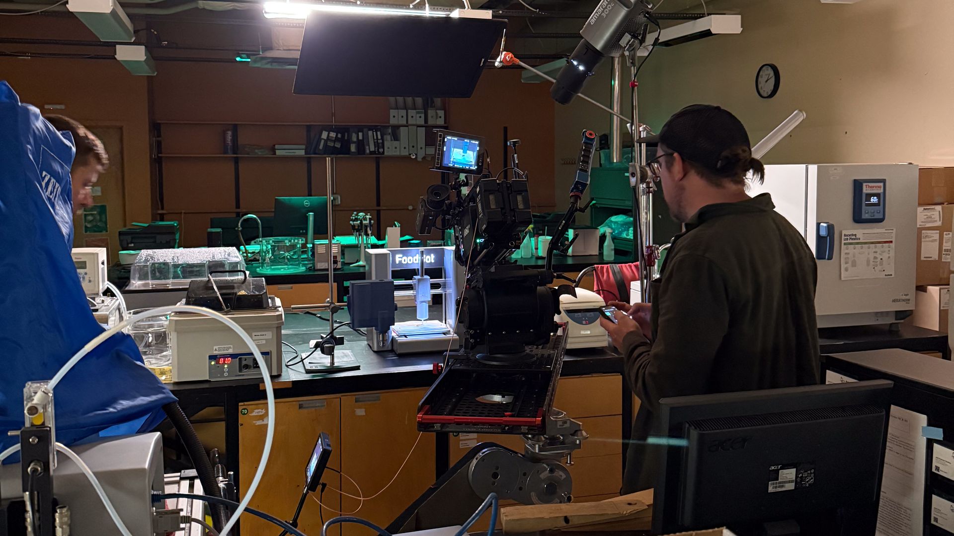 Cinematographer, Mike McLaughlin, previewing the next set-up, capturing the unique process of 3D printed proteins.